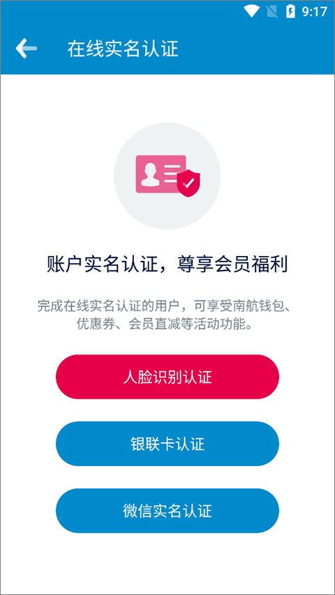 2、在打开的在线实名认证页面中,选择一种认证方式点击即可进行认证,目前提供三种认证方式,分别是:人脸识别认证、银联卡认证、微信实名认证,此处以第一种人脸识别认证方式举例说明