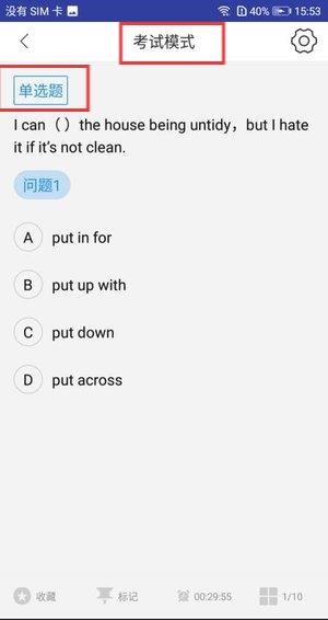 2、打开考博英语题库软件,在首页界面中,点击考试模式,进入后选择单选题题型开启练习;