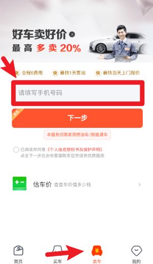 3、点击“卖车”进入后填写手机号并点击“下一步”,将由平台客服联系提供估价和后续服务;