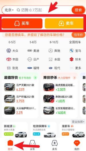 2、切换“买车”与“卖车”模块可自由浏览不同服务内容,并支持按照价格、品牌等筛选条件;