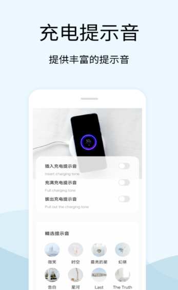 1、充电提示音,提供丰富的提示音,可选择并试听。