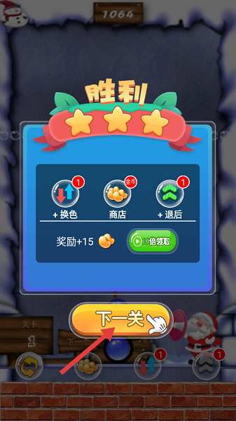 4、成功通关后,点击【下一关】,继续挑战,同时可领取奖励或倍领取金币。