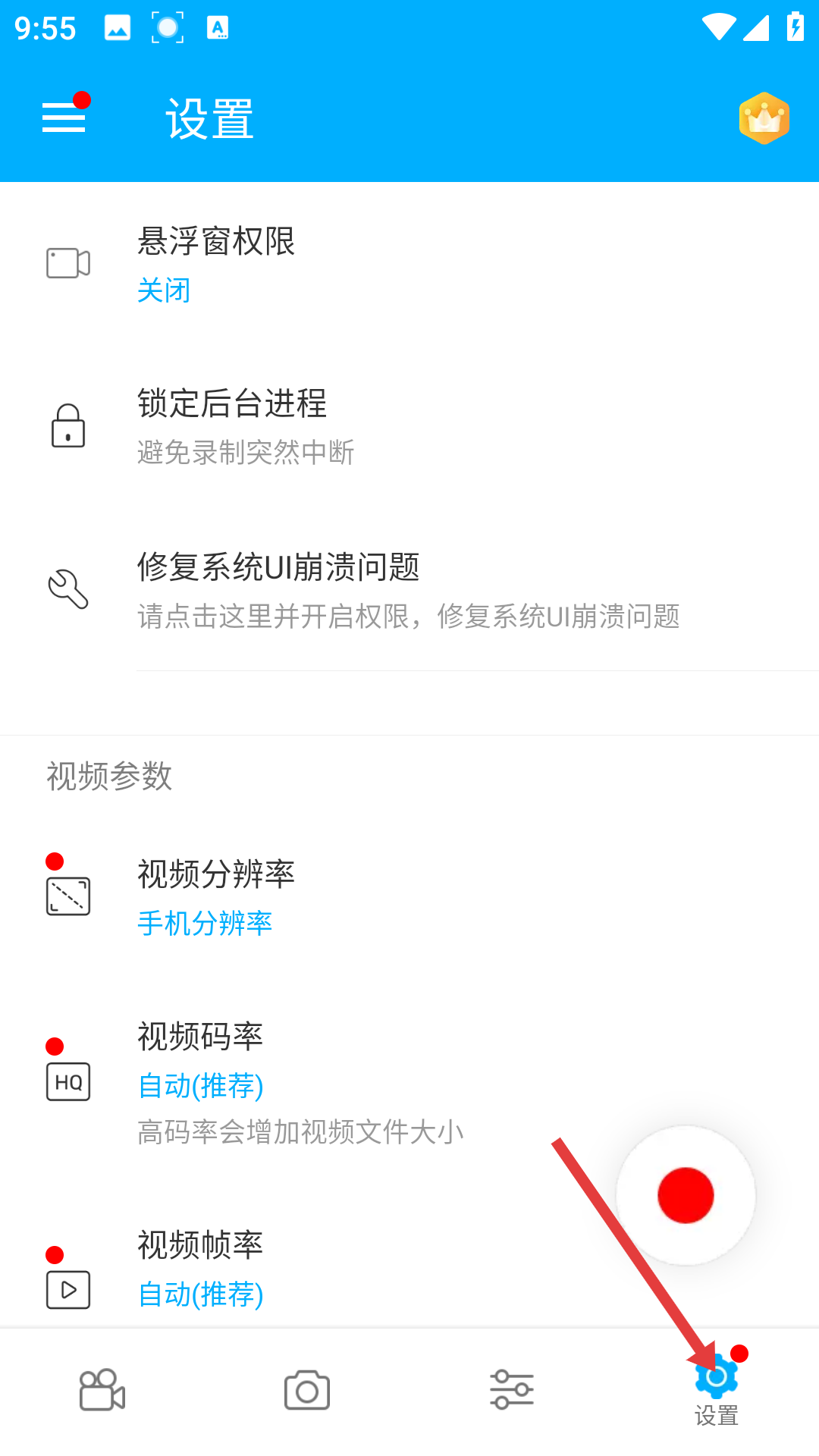 3、若需调整录制参数点底部设置,在设置页可管理悬浮窗权限、锁定后台防中断,还能设置视频分辨率、码率、帧率,按需优化录制质量。