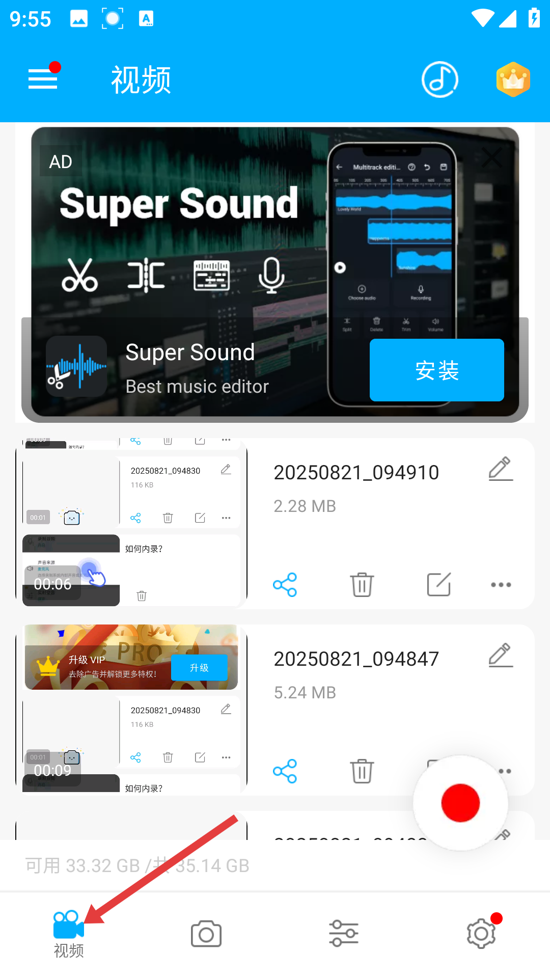 1、打开超级截图录屏大师,点击底部视频进入视频管理页,已录视频按时间排序展示,可查看大小、时长,还能分享、删除、编辑,便捷管理录制内容;