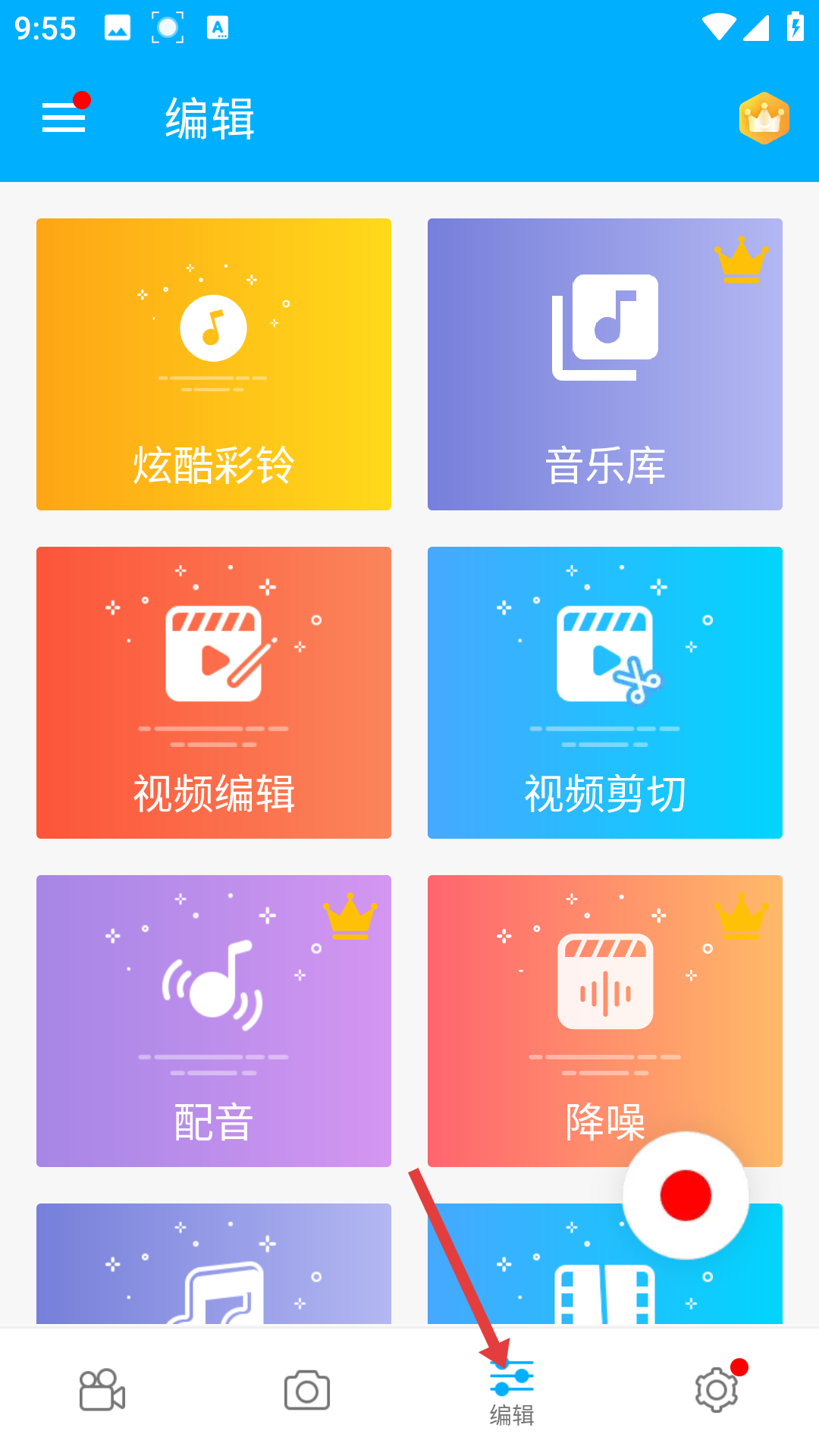 2、用户若想对视频加工,就点底部编辑进入编辑页,有炫酷彩铃、音乐库、视频编辑等功能,能给视频配乐、剪辑、配音、降噪,丰富录制的视频效果;