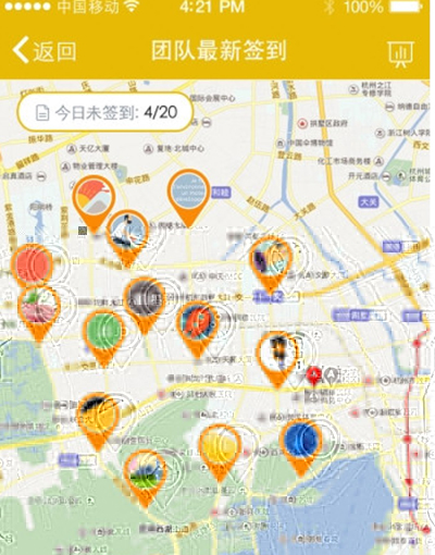3、而管理人员则可通过签到页面,直接查看到团队的签到情况及签到历史,还可以查看团队成员的签到位置。