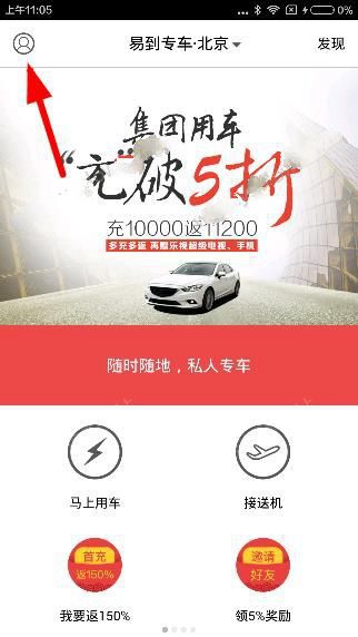 1、用户进入易到用车的首页后,点击左上角的头像按钮,如下图: