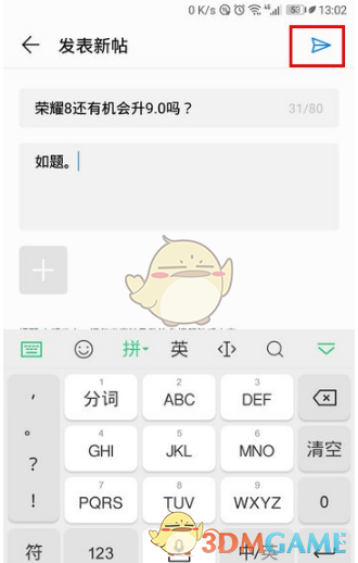 5、输入帖子的标题和正文内容以后,点击右上角的飞机图标发表。
