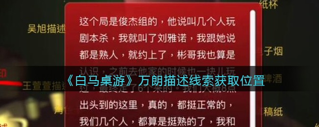 以上就是3DM小编整理带来的《孙美琪疑案:白马桌游》万朗描述线索获取位置,大家还喜欢吗?更多精彩内容,请点击关注3DM手游网,小编将持续为您更新!