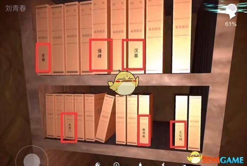 审讯室内桌子后面的书架上,如图,点击对应的档案盒会抽出来一下即可获取线索。