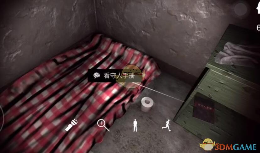 如图,打开地铺旁边的柜子下面那层,点击里面的书获取线索看守人手册。
