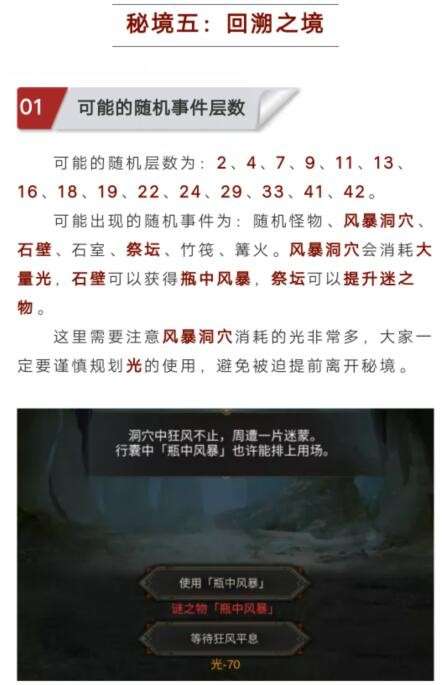 可能出现的随机事件为:随机怪物、风暴洞穴、石壁、石室、祭坛、竹筏、篝火。风暴洞穴会消耗大量光, 石壁可以获得 瓶中风暴,祭坛可以提升迷之物。