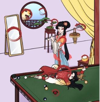 2、图中的镜子是照妖镜,窗外的狗是哮天犬,云是筋斗云;宝玉拿着金箍棒,桌腿上的金箍