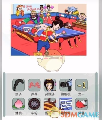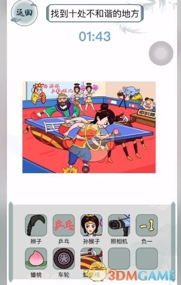 文字玩出花小游戏是一款文字题材闯关冒险手机游戏,关卡兵乓西游怎么过?这一关给出的图是哪吒和沙僧打乒乓球比赛的场景,大家需要在图中找出十个不和谐的地方,实际就是找现代物品,本关不和谐处为:辫子、乒乓、孙猴子、照相机、负一、蟠桃、车轮、蜘蛛精、蜘蛛网、武器。下面是3DM小编给大家带来的《文字玩出花》兵乓西游攻略,还没有通关的小伙伴可以来看看,希望能帮助大家!