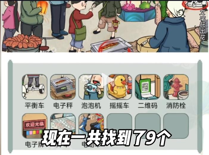 答案:摇摇车、电子秤、草莓塔、海里捞、电子牌、计算器、平衡车、二维码、消防栓、炸串、电动车、泡泡机。