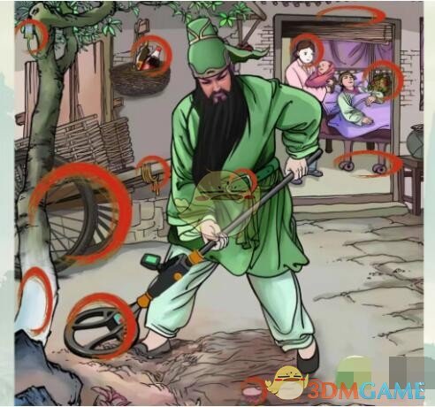 3、关羽手里拿着探测仪,腰间是皮带,移动探测仪找到藏在土地下的酒,可以发现现代盖子