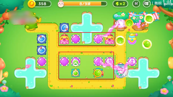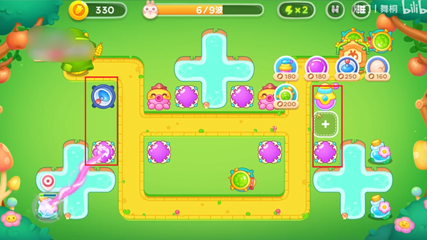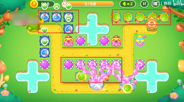 3、有钱就升级已经放置的炮台,还有钱就放更多的魔法球,在第六波的时候去左边建造两个炮塔,用来清理最后的道具。