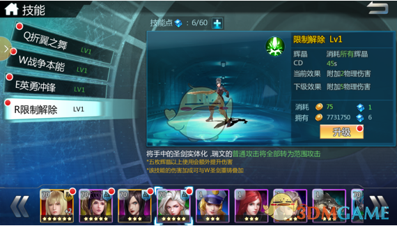 限制解除(R):将手中的圣剑实体化,瑞萌萌的普通攻击将全部转为范围攻击(五枚辉晶以上使用会额外提升伤害,该技能的伤害加成可与W圣剑重铸叠加。)