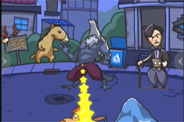 5、拖动太阳进垃圾桶,就变成傍晚了,点击中间的男性NPC就完成仰天长啸了。