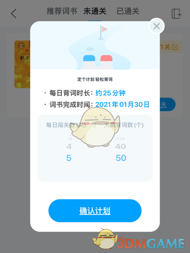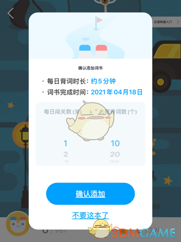 2、进入后点击左上角的返回按钮后,会弹出确认添加词书的窗口,在这里我们就能够选择每日的闯关数量和背词的数量了。然后点击确认添加按钮,即可保存此词书。