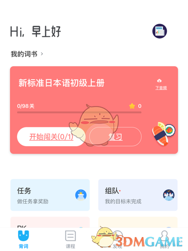 3、如用户们需要调整、更改每天的关卡单词数量的话,可以点击背词界面的“我的词书”按钮,查看自己添加的词书。