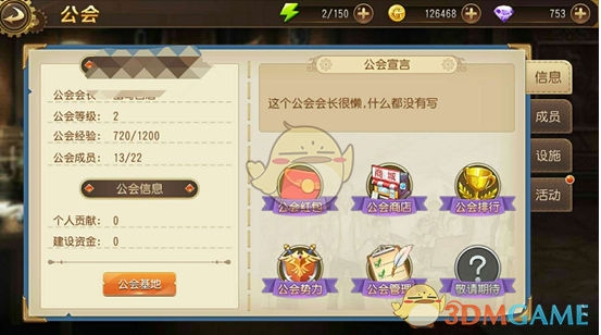 1、 膜拜:,帮助公会升级,随着等级提升可提高公会伙伴的数量。