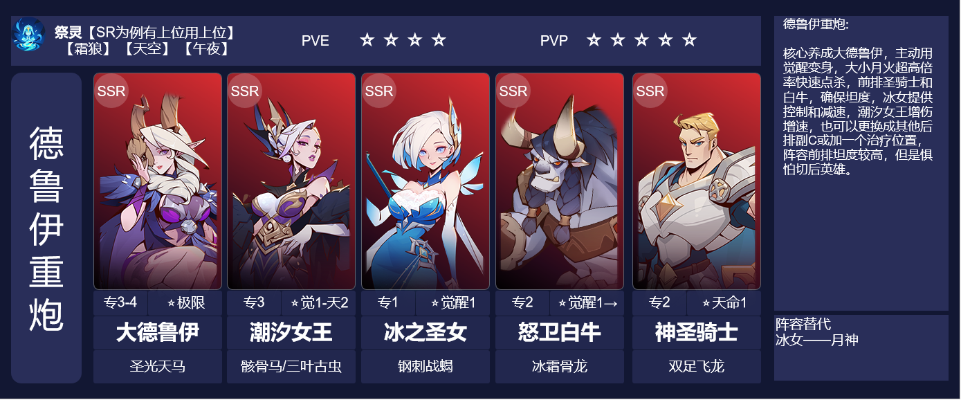 【阵容简述】核心养成大德鲁伊,主动大招用觉醒变身,大小月火超高倍率快速点杀,前排圣骑士和白牛,确保坦度,冰女提供控制和减速,潮汐女王增伤增速,也可以更换成其他后排副C或加一个治疗位置,阵容前排坦度较高,但是惧怕切后英雄。