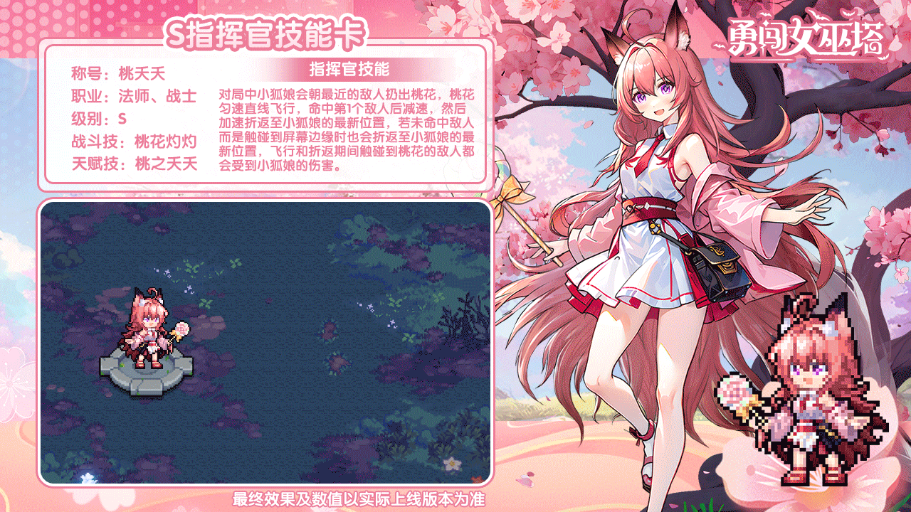 今天给大家带来了《勇闯女巫塔》S指挥官桃夭夭介绍,全新S级指挥官——桃夭夭已经上线,领主大人缺桃花吗?桃夭夭给你!作为法师+战士双职业的指挥官,桃夭夭的武器是会向敌人扔出的桃花,不仅距离最近的敌人会降低速度,被桃花击中的敌人也会受到桃夭夭的伤害。