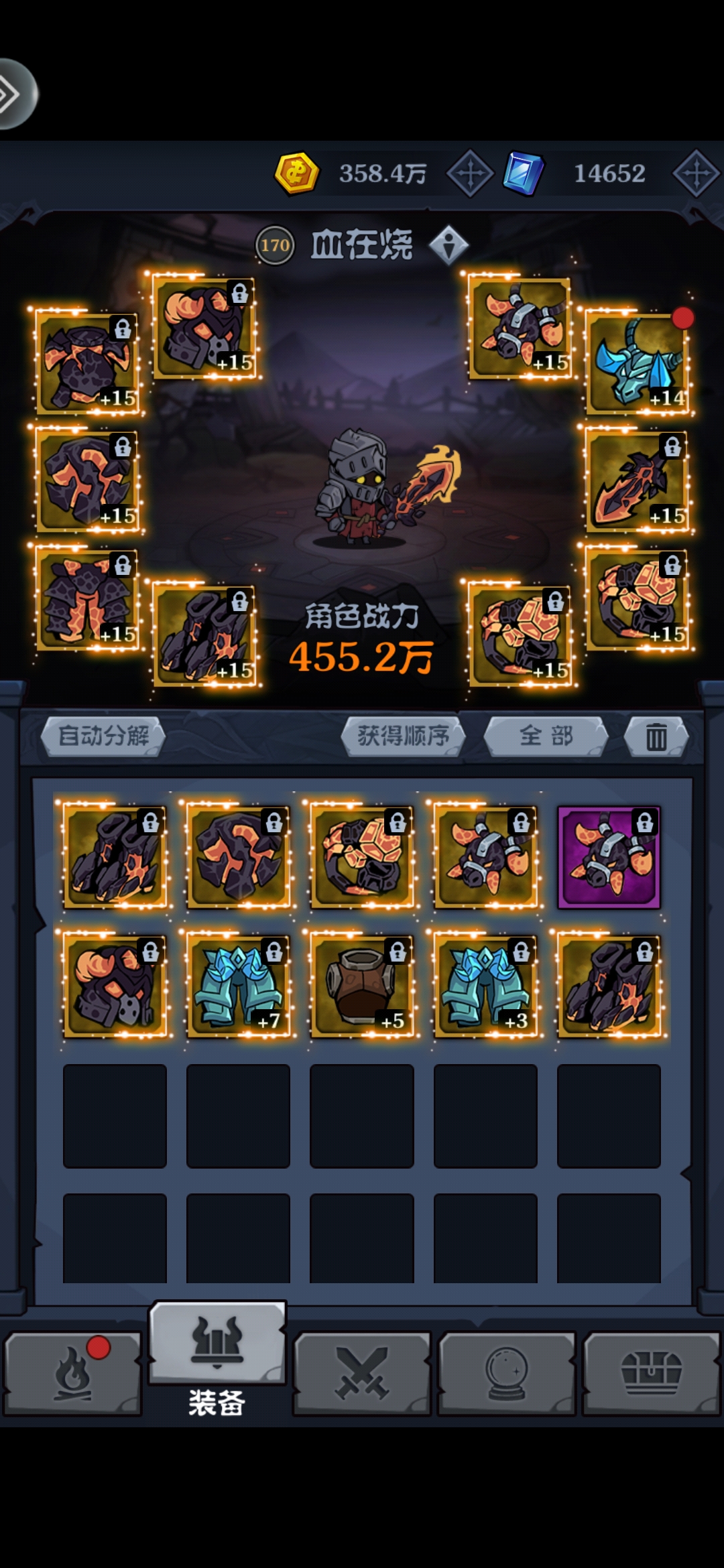 7、装备强化,前期强到十就可以了,强化失败会损失金币强化石,别的分解返回全部金币强化石。到了80级左右的橙装,有好的就可以强上十五了,100级的全部上十五。