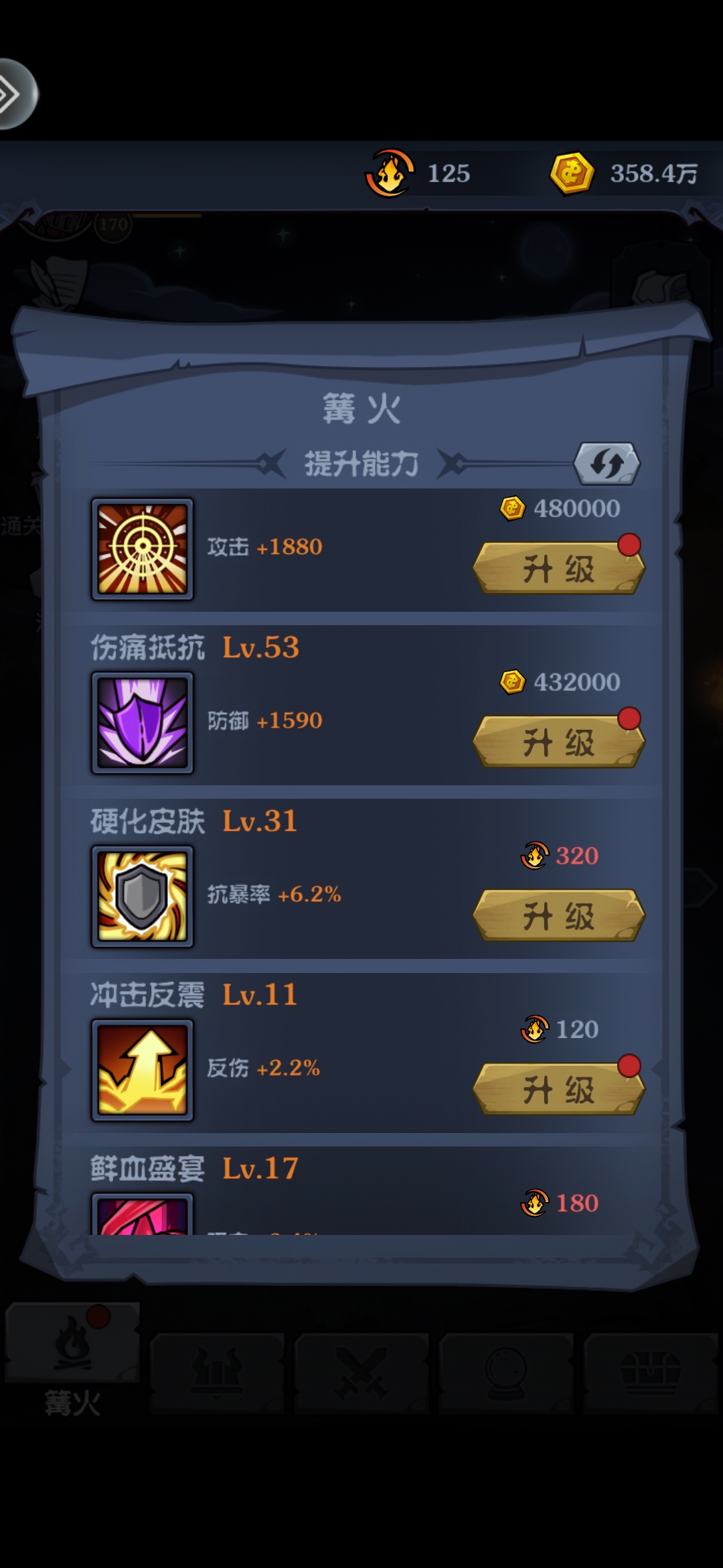 5、篝火,金币在满足强化,圣物合成的前提下就升吧,需要火苗的优先点硬化皮肤,别的随便点点吧