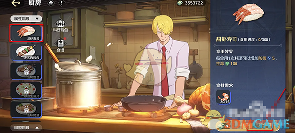 甜虾寿司是航海王壮志雄心游戏内的食谱,这个食谱的制作原料是虾,我们在厨房制作该食物后,即可进行食用,提升防御和生命加成效果,不过很多玩家对甜虾寿司食谱的食用方法可能还不是太清楚,下面就让小编给大家带来《航海王壮志雄心》甜虾寿司食用方法,感兴趣的继续往下看看吧。