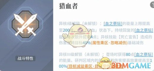 异核IⅢ级解锁(未解锁):登场时获得80点[血之祭坛】的能量。研判区域内的敌人受到伤害提高效果提高至100%(目标减益乘区·目标受伤害增加)