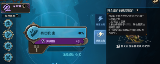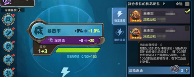 这里要提醒大家,不同中枢对机芯配件的要求不同,例如注能“暴击伤害”中枢就需要机芯配件满足暴击伤害属性要求,并且对应的机芯属性越高相应的注能经验也就越多。