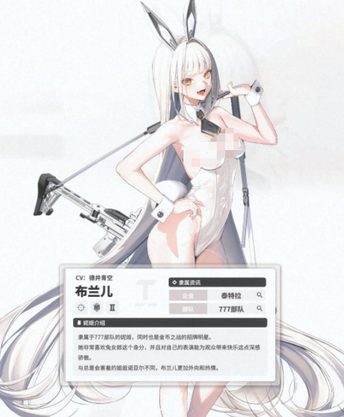 布莱尔这个角色在游戏里的穿着非常清凉,白色的头发加上白色的服装以及黑色的兔耳朵,会让这个角色既优雅同时又带着一丝妩媚,黄色的瞳孔,也给角色增加了一种神秘感,角色所属777部队,是一个二阶风压属性的角色,在对战的过程中会使用步枪进行攻击,游戏主打的是防御,除了能给全体队员,带来一定的输出能力提升之外,还可以保护队友不受到对方过多的伤害。