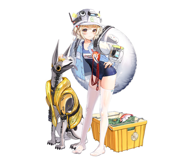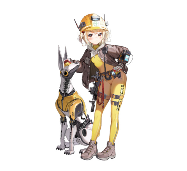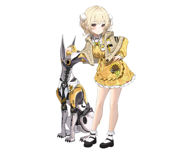 丽塔在游戏里非常有辨识度,经常会穿着一身黄棕配色的服装,头上还会戴黄色的帽子,这个角色身边还会跟着一只白色的机械狗,这条狗身上也会有大量的黄色装饰,另外角色还可以更换成泳装或者是洛丽塔服装,不变的就是角色标志性的浅金色短发,加上棕黄色的瞳孔。