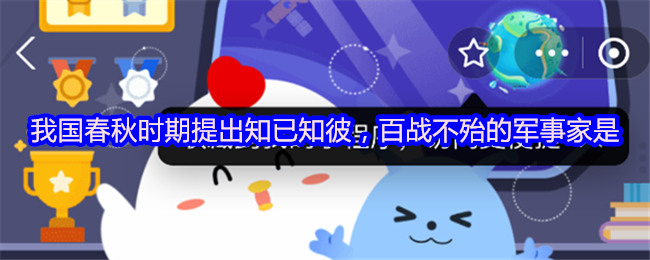 以上就是我国春秋时期提出“知已知彼,百战不殆”的军事家是?支付宝蚂蚁庄园今日答题答案最新4.21,更多精彩内容,请点击关注3DM手游网更新!