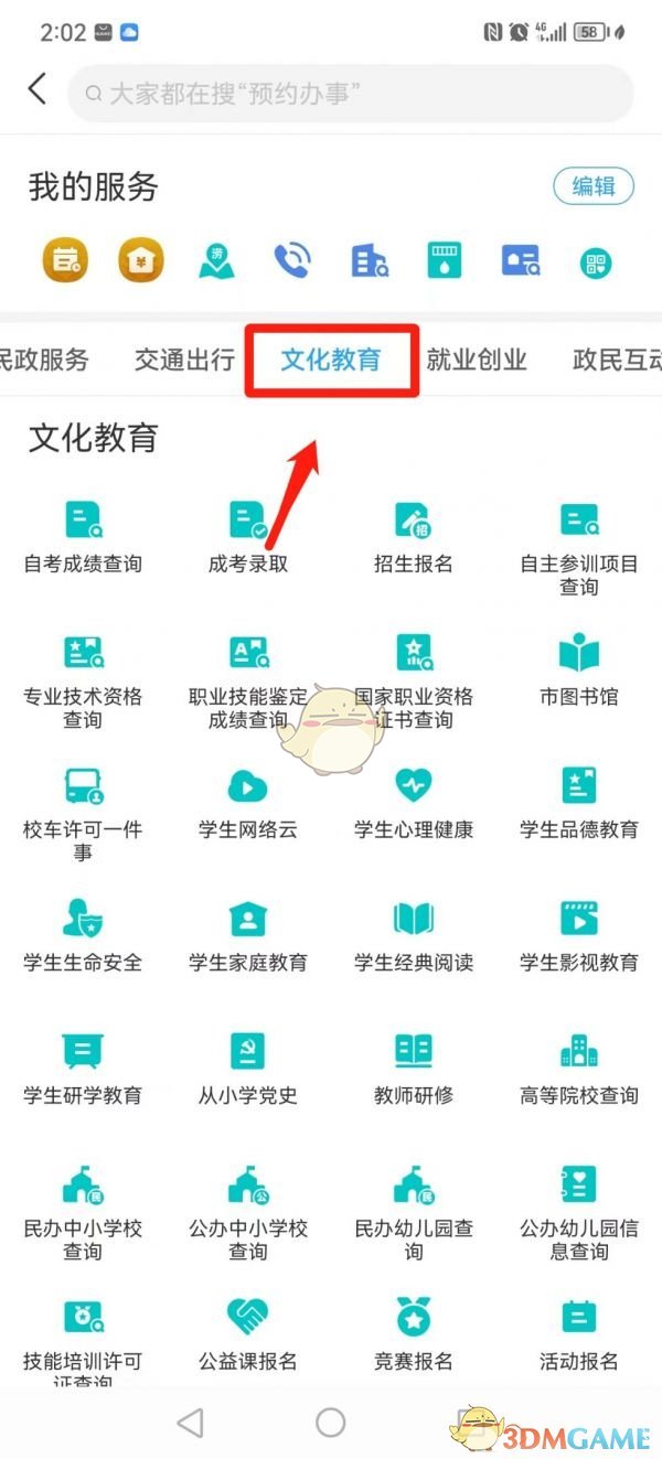 2、在APP首页找到“更多服务”,找到“文化教育”;