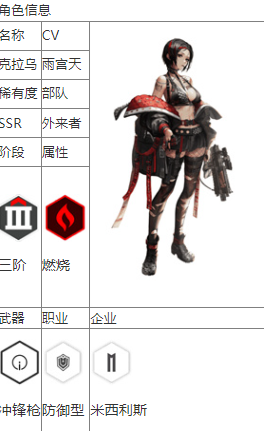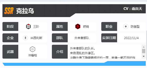 克拉乌为SSR品质,定位防御型,定位于防御型,手上的冲锋枪就是主要的关键所在,整体的优势性还是很不错的。战斗中的克乌拉,实力真的不容小看,每一次攻击都会造成将近8.94%的攻击力伤害。