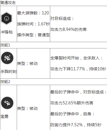 被动技能蛮勇是很关键的,将最后一颗子弹射出并且直接命中目标时就会造成额外伤害,伤害指数达到52.65%。同时在持续5秒的时间内还会提升7.5%的防御力。在增强输出的同时,还可以有效提高生存的能力。加上40秒的冷却技能,对于攻击力比较高的敌人还可以直接发出强势的攻击。