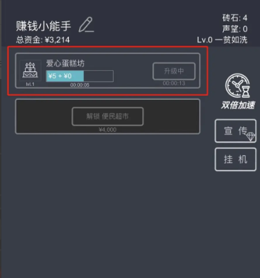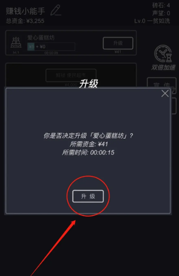 在挂机当富豪游戏中爱心蛋糕坊是可以升级的,进入游戏在首页中找到上方的“升级”按钮,进入后需要消耗资金去升级!具体可看看下方分享!
