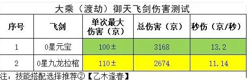 飞剑选择方面,用0星九龙拉棺和0星元宝进行测试,数据如下