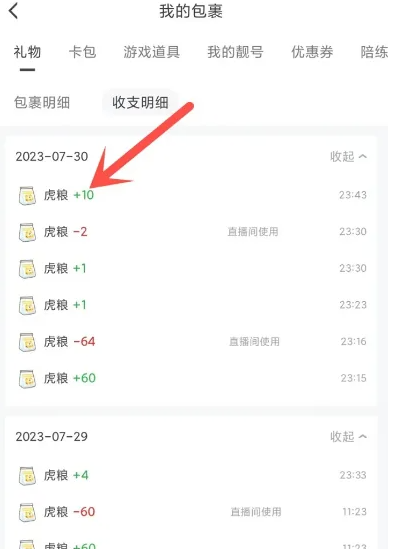 点击进入我的页面,点击我的包裹,打开礼物列表,点击收支明细,即可查看虎粮收支记录。虎牙直播致力于为用户带来全新的视听体验。这款软件不仅集成了海量的游戏、娱乐、体育等各类直播内容,还通过高清画质、多平台同步等特色功能,让用户在家中即可轻松享受高品质的直播节目。