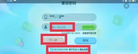 输入验证码,勾选我已阅读并同意,点击下一步,重置密码即可。