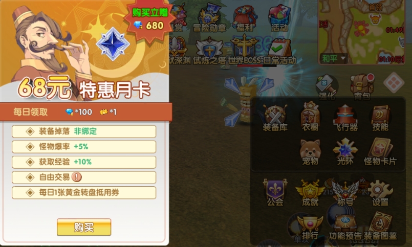 经过实测,游戏交易体系相当完备,设有拍卖行和面对面交易两种模式。不过想要开启自由交易 “大门”,需要开通68的玥咔。开通后不仅能解锁装备非绑、自由交易功能,还能享受爆率提升、每日钻石领取等超值福利,是搬砖党的 “入场券”。