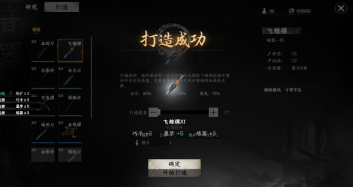 在抵达铁匠处之后,打开背包拿出里面的暗器。在打造时还需要注意指针的滑动节奏。金色区域就可以增加20%的灵感值,直接会影响到属性加成,而一旦成功之后就可以加入到唐门。要想完成晋升,那首先还需要掌握属性要求的条件。成为内门弟子要成为机师,研发二阶暗器,收到飞鸽之后去完成流言蜚语任务。想要成为关门弟子,要晋升成鬼府,三阶段的暗器接取维护机关的任务,然后获取护体神功。其实晋升的步骤还是需要循序渐进的,必须要严格按照要求,如此才有好的效果。