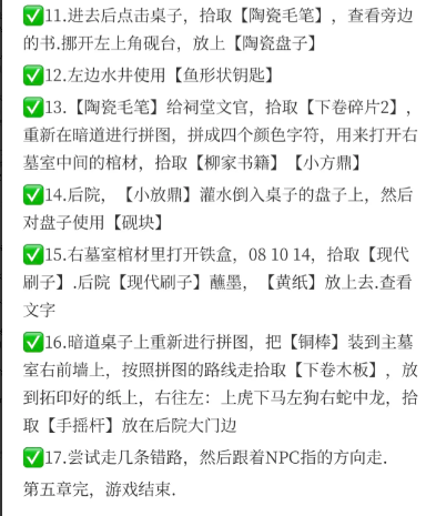 16.暗道桌子上重新进行拼图,把【铜棒】装到主墓室右前墙上,按照拼图的路线走拾取【下卷木板】,放到拓印好的纸上,右往左:上虎下马左狗右蛇中龙,拾取【手摇杆】放在后院大门边