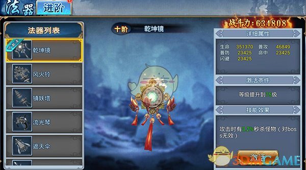 乾坤镜是玩家拥有的第一个法器,满阶后的基础属性中规中矩,法器技能算是挂机神器,几率秒杀,能够在段时间内获得更多的收益,可以在下线前切换。