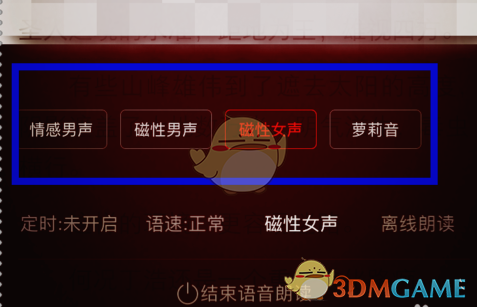 6.在控制界面中向上滑动,可以发现会再出来一个声音设置选择界面,可以根据喜好选择阅读者的声音类型,比如普通话男、普通话女,还有一些比较多人群的特殊方言,如广东话、湖南话。