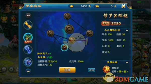 进入注灵界面可以对当前神器阵法进行注灵,需要消耗灵气值。阵法注灵后能够提升相应的属性。注灵到最后一个后,还能进行阵法突破,开启一个新的阵法。