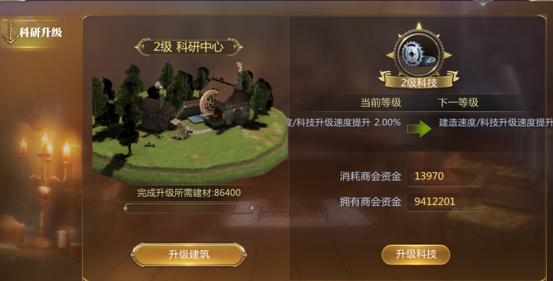 社会组织的发展离不开科学技术,科研中心能有效地提高商会建筑建造及科技升级的效率。商会科研中心的不断提升,将高效地提升帮会整体建筑建造速度,助力商会更快的发展。